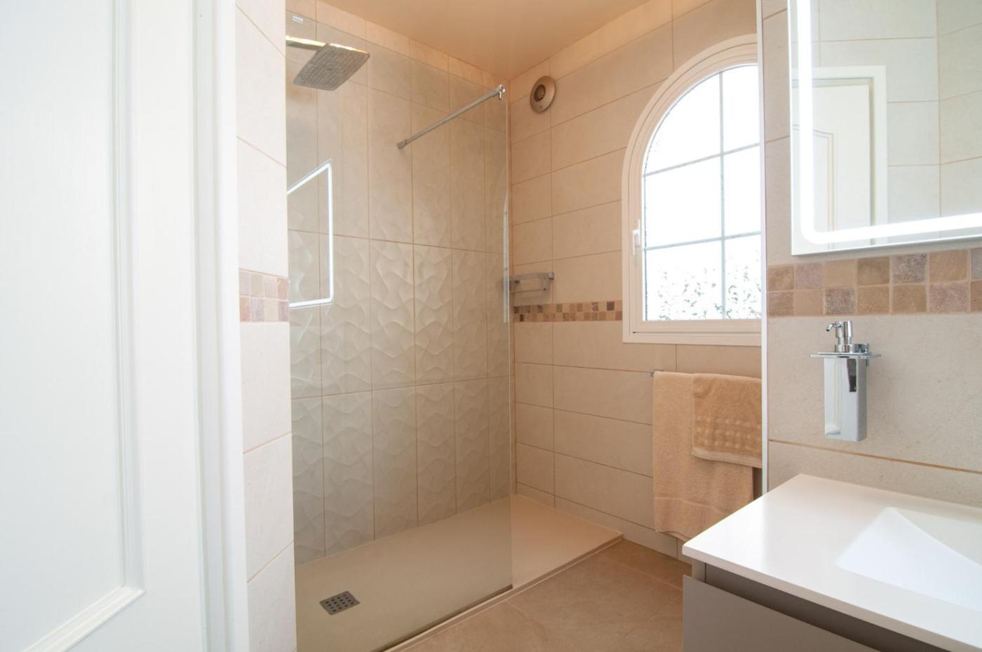 The spacious villa with a terrace and sea views has 3 bedrooms, a living room, a flat-screen TV, an equipped kitchen with a dishwasher and an oven, and 4 bathrooms with a walk-in shower. Towels and bed linen are offered in the villa. For added privacy, the accommodation has a private entrance and soundproofing.