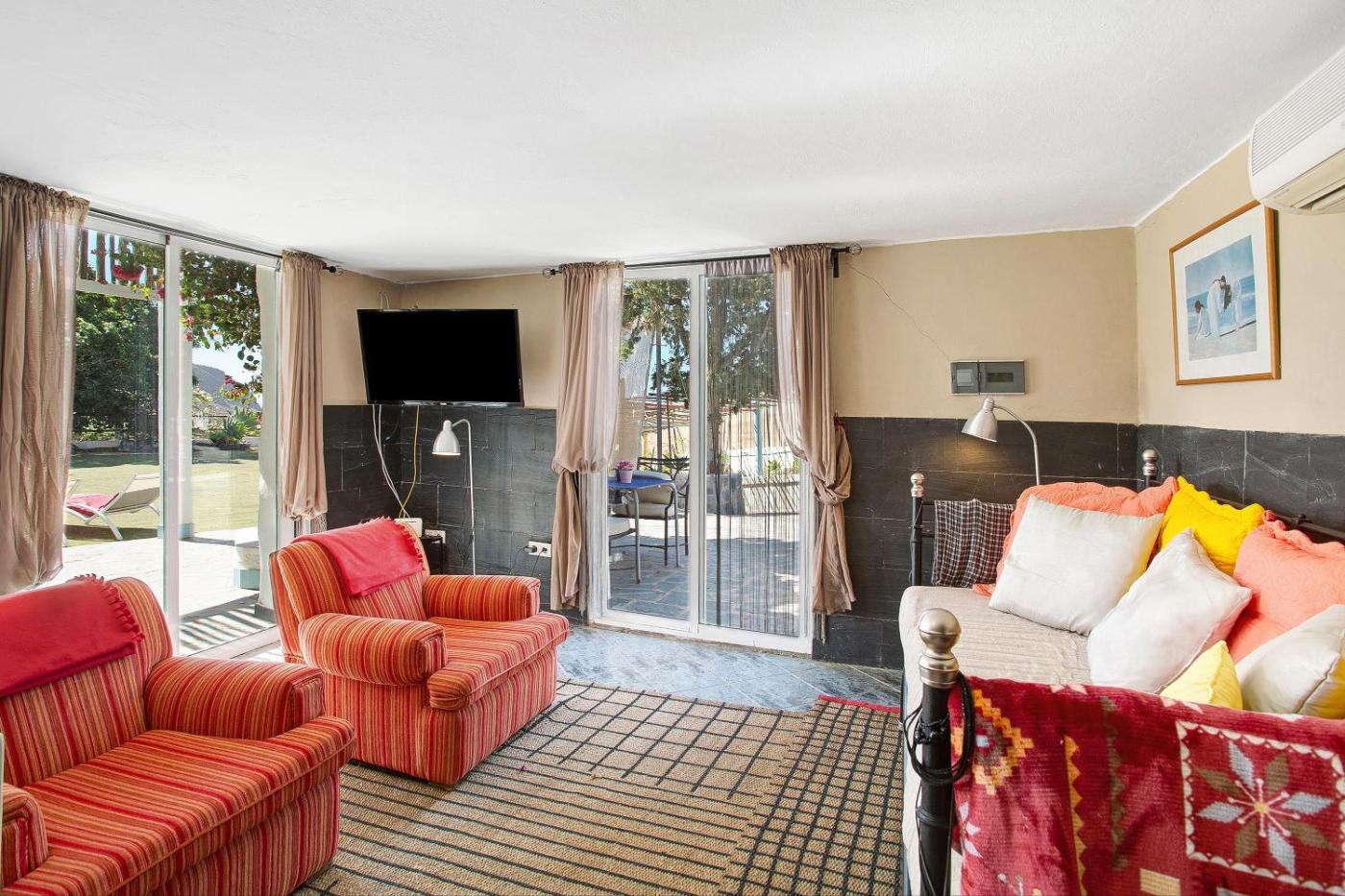 Villa with Garden View. This villa includes 1 living room, 1 separate bedroom and 1 bathroom with a bath and free toiletries. The well-fitted kitchen has kitchenware, a microwave and a toaster. The air-conditioned villa offers a TV, a washing machine, a coffee machine, tumble dryer as well as garden views. The unit has 2 beds.