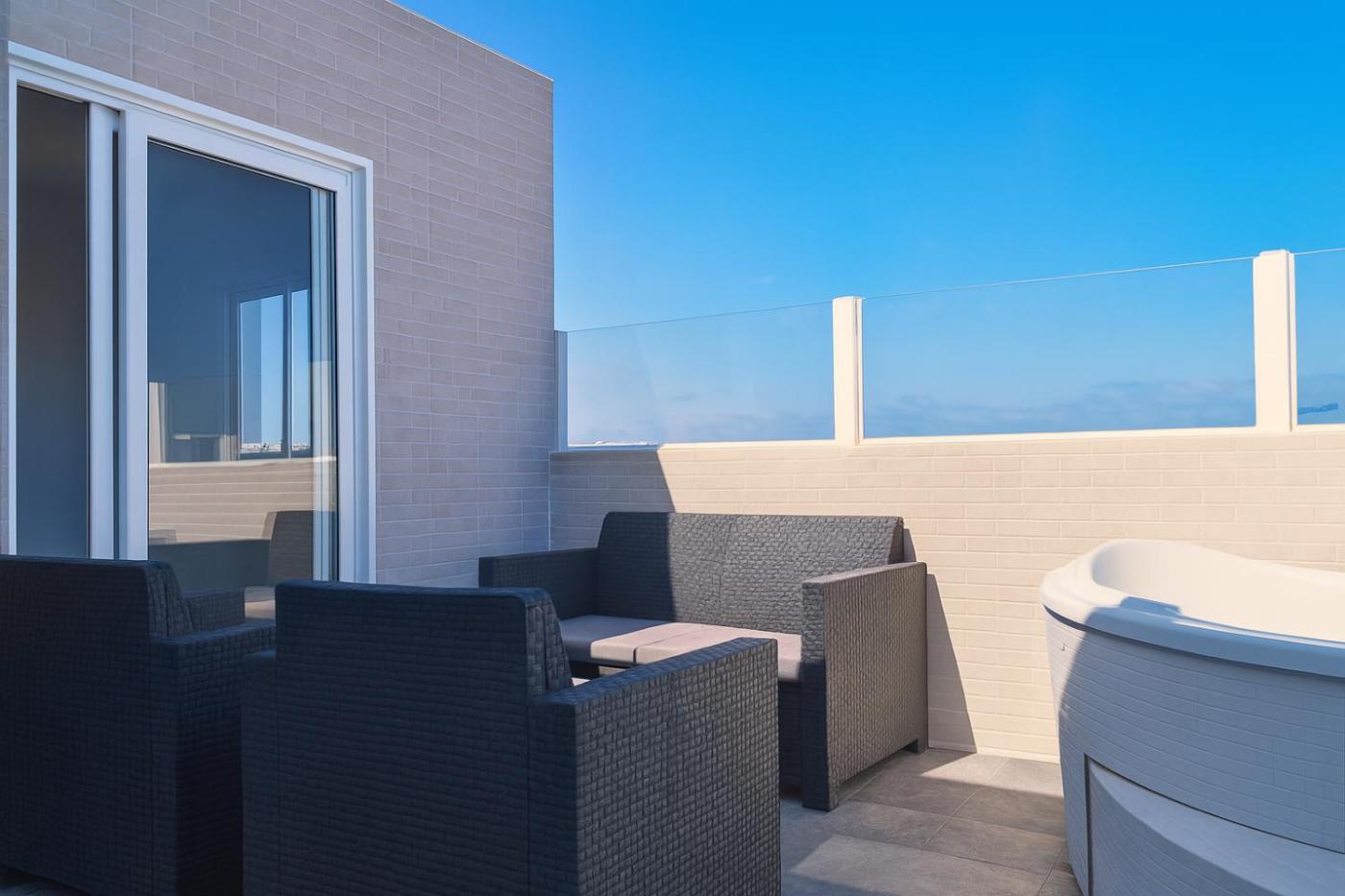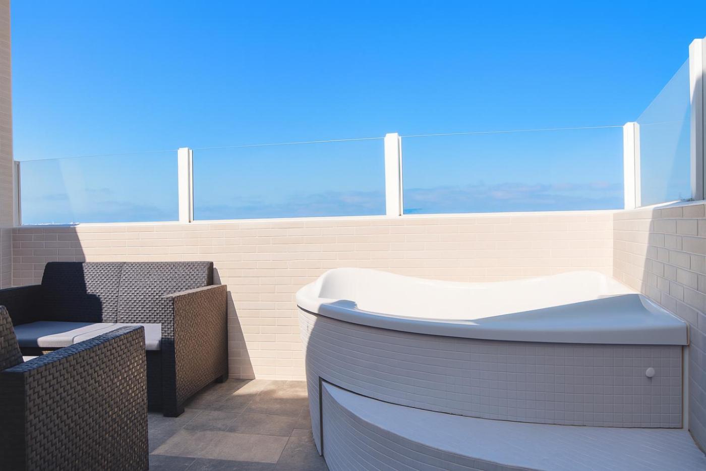 Two-Bedroom Apartment. This apartments special feature is the hot tub. This apartment comprises 1 living room, 2 separate bedrooms and 1 bathroom with a bath and free toiletries. Guests will find a stovetop, a refrigerator, kitchenware and an oven in the well-equipped kitchen. The apartment also provides guests with a barbecue. Featuring a terrace with sea views, this apartment also provides a washing machine and a flat-screen TV with streaming services. The unit offers 3 beds.