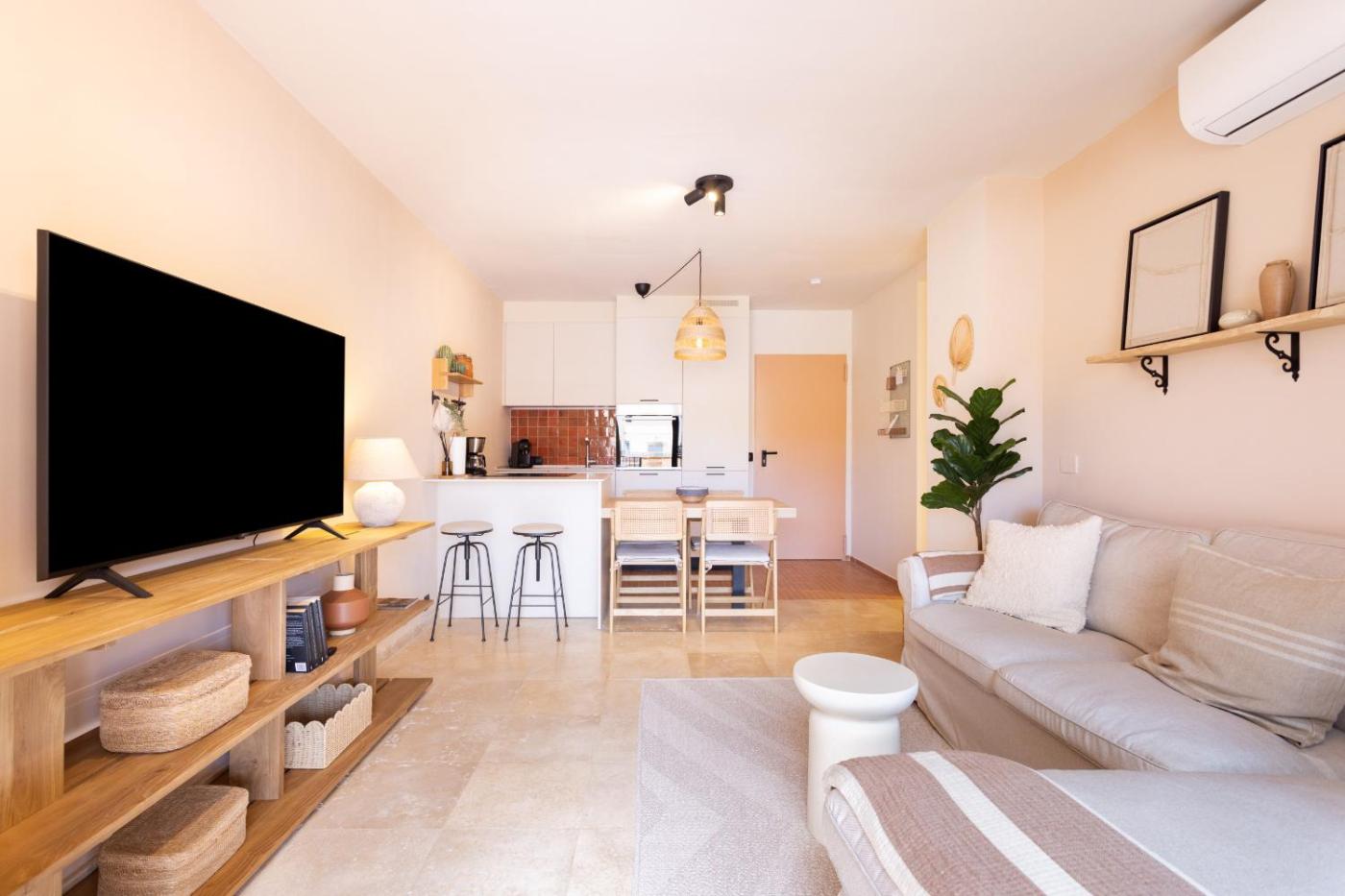 Two-Bedroom Apartment with Terrace. Boasting 2 bedrooms and 2 bathrooms with a shower, this apartment has a well-fitted kitchen and a terrace. Guests can make meals in the kitchen that is fitted with a refrigerator, a dishwasher, kitchenware and an oven. The apartment offers a washing machine, a tea and coffee maker, tumble dryer, a TV, as well as pool views. The unit offers 3 beds.