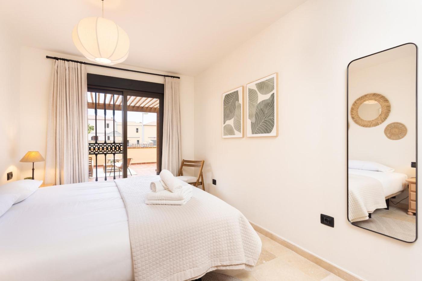 The apartment is equipped with 2 bedrooms, 2 bathrooms, bed linen, towels, a TV, a fully equipped kitchen, and a terrace with pool views.