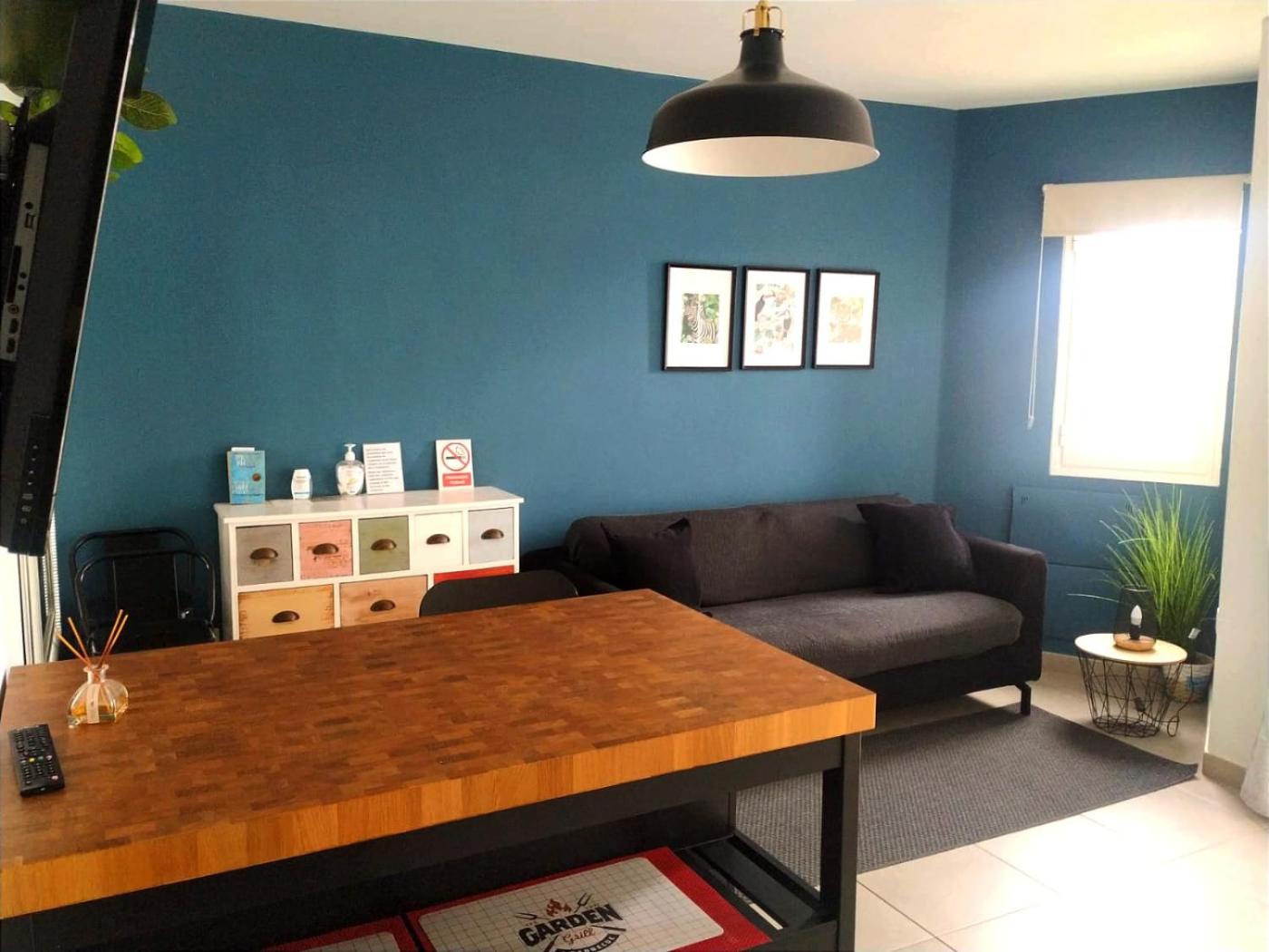 The apartment with a balcony and garden views features 1 bedroom, a living room, a flat-screen TV, an equipped kitchen with a microwave and a toaster, and 1 bathroom with a shower. For added privacy, the accommodation has a private entrance and soundproofing.
