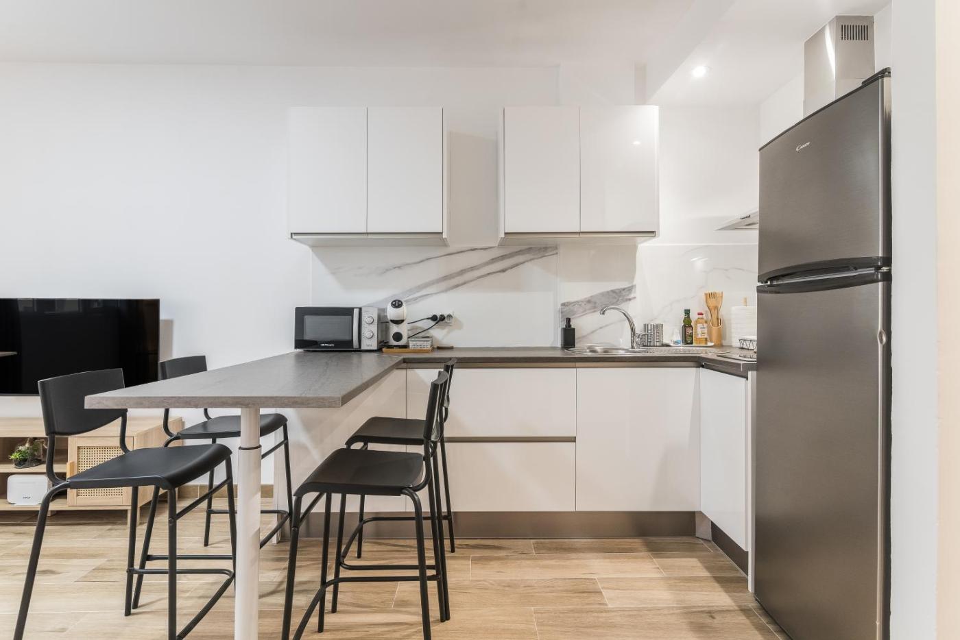 One-Bedroom Apartment. This apartment consists of 1 living room, 1 separate bedroom and 1 bathroom with a shower and a hairdryer. Guests can make meals in the kitchen that is equipped with a stovetop, a refrigerator, kitchenware and a microwave. The apartment provides a washing machine, a coffee machine, a seating area, a wardrobe, as well as a flat-screen TV. The unit offers 1 bed.