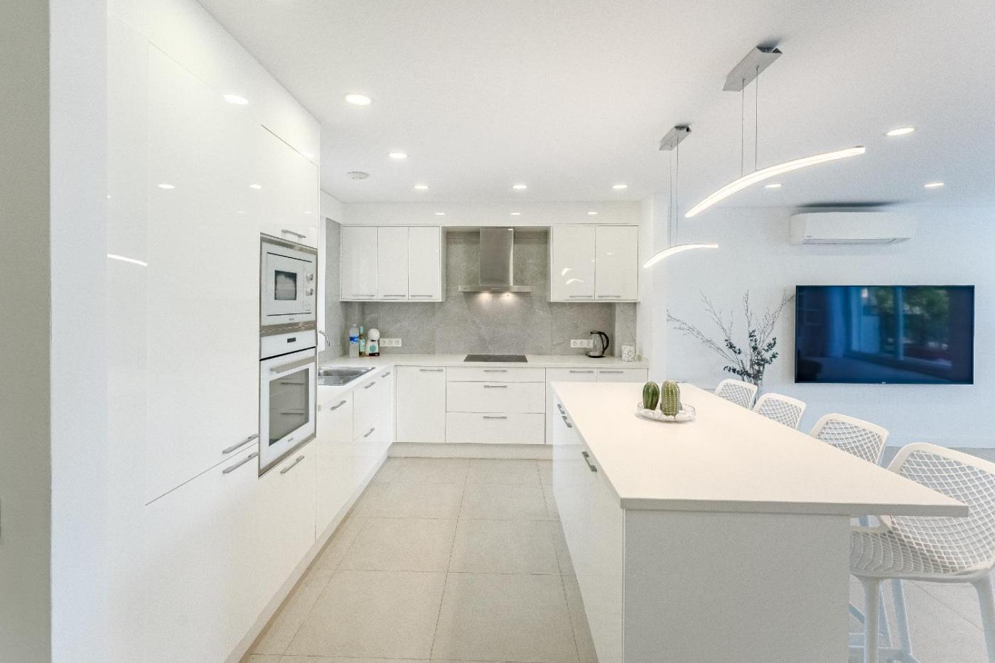 Three-Bedroom Villa. This villa features a private pool. This spacious villa features 3 bedrooms, kitchen, a terrace and 3 bathrooms with a bath. The fully equipped kitchen has a stovetop, a refrigerator, a dishwasher and kitchenware. The air-conditioned villa features a flat-screen TV, a washing machine, a tea and coffee maker, a dining area as well as sea views. The unit has 4 beds.