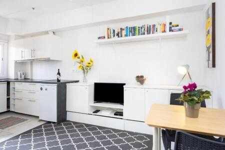 One-Bedroom Apartment. Boasting 1 bedroom and 1 bathroom with a hairdryer, this apartment has a well-fitted kitchen and a seating area. A kitchen fitted with a refrigerator, kitchenware and a toaster is available for cooking and storing food. The apartment features a washing machine, a coffee machine, a wardrobe, a high chair for children and a flat-screen TV with cable channels. The unit offers 2 beds.