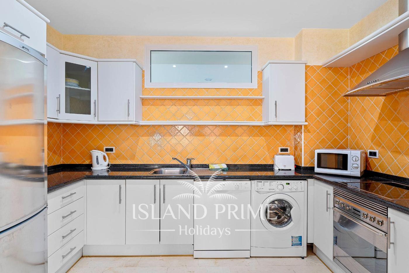One-Bedroom Apartment. This air-conditioned apartment consists of 1 living room, 1 separate bedroom and 1 bathroom with a bath. Guests can make meals in the kitchen that is equipped with a stovetop, a refrigerator, a dishwasher and kitchenware. Featuring a balcony with sea views, this apartment also provides a washing machine and a flat-screen TV. The unit offers 1 bed.